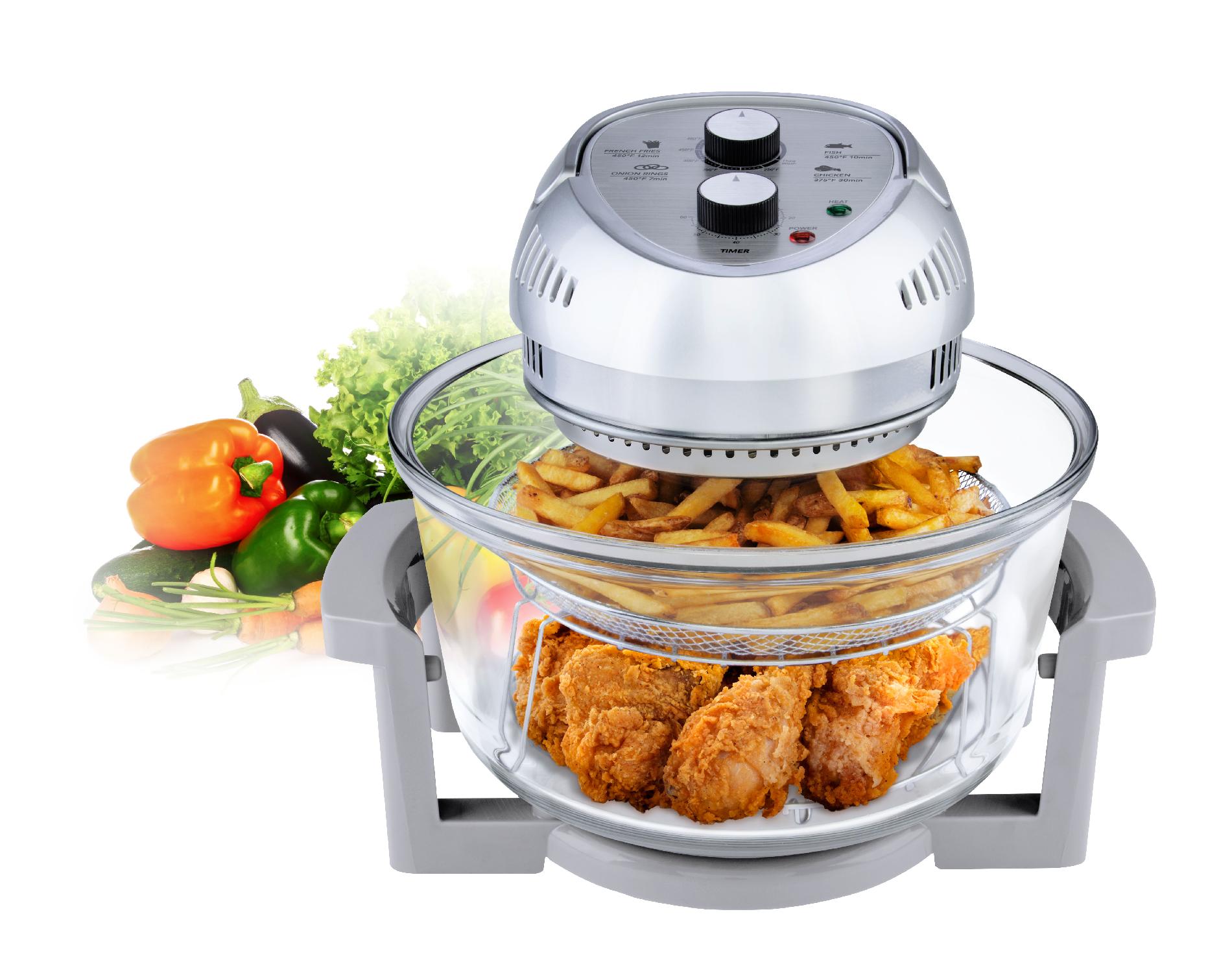 Introducing Big Boss Oil-Less Fryer, the energy efficient tabletop cooker that combines halogen heat, convection and infrared technology leaving food moist on the inside and browned and crispy on the outside without the use of added fats or oils. Features: -Three cooking elements working in uniform. -Halogen directly heats the surface of the food for browning, roasting and flavor. -Convection circulates the hot air, evenly distributing the heat for faster cooking. -Gentle infrared heat cooks from inside out, sealing in juices, roast turkey, bake fish, broil steaks, air fry chicken, grill meats, toast breads, steam vegetables and even make dessert, all without preheating or defrosting. -Glass dome allows you to see the cooking process. -Lid's tight seal keeps hot air inside. -Includes 2 cooking racks (low and high) allowing you to prepare a whole meat at once. -Dimensions: 13.5" H x 12.5" W x 16" D.