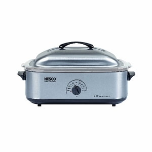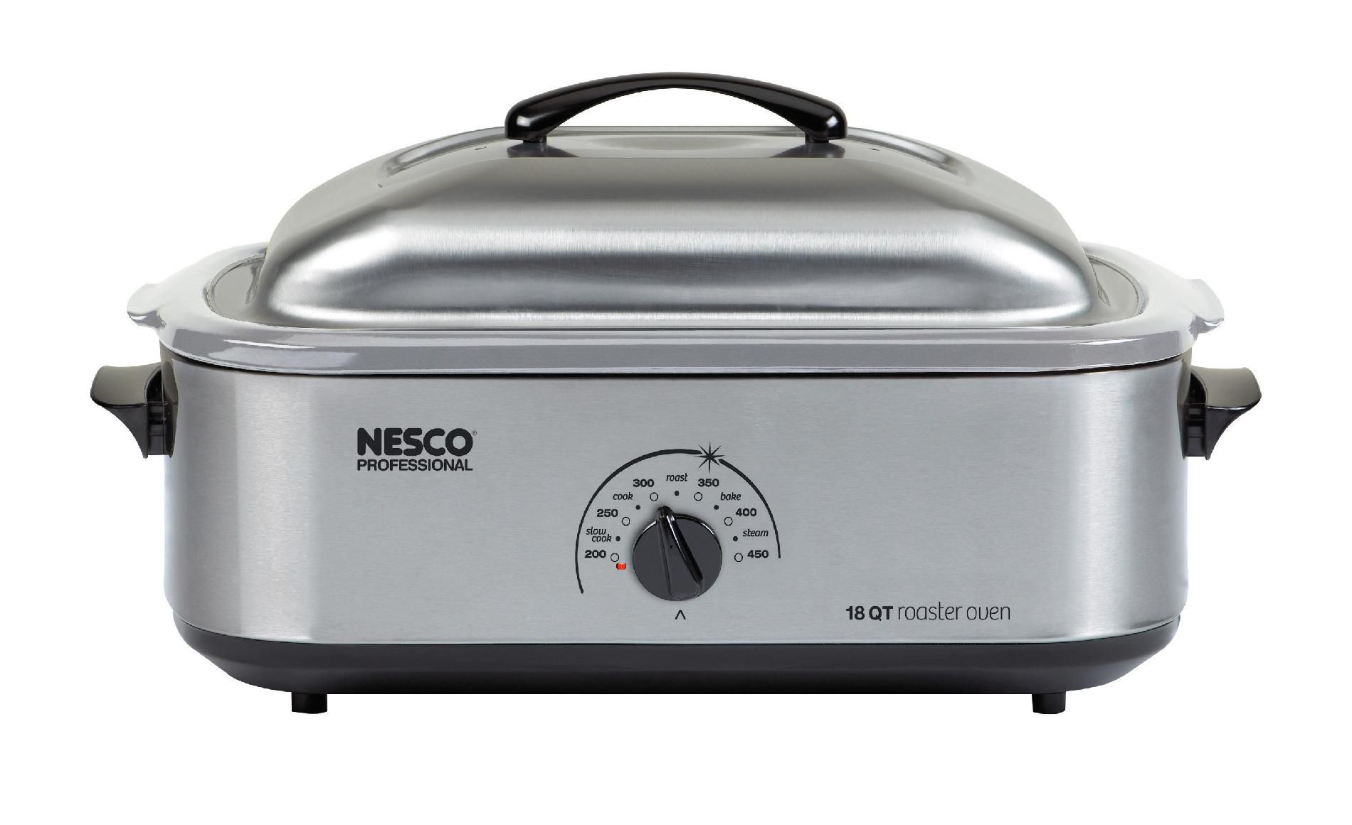 Capacity: 18-Quart How many settings: See below Dimensions: 24 x 15.5 x 12.5 inches Materials: Metal, Plastic, Electronic Assembly required: No Adjustable full-range temperature control up to 450 degrees Removable cookwell for easy clean-up Porcelain coated surface resists scratches, corrosion, stains and chips Chrome plated cooking/baking rack Entire unit is easy to handle and easy to store The NESCO 18-quart. Roaster Oven is your portable, "go anywhere" second oven capable of doing everything a traditional oven does, except broil. For many, it's the primary kitchen oven. For others, a second oven for the family room, porch, or cabin. It's portable, so you can take it along for family outings. It is ideal for large meals and entertaining in the home. Roast a whole turkey, up to 22 pounds, pot roast, pork roast, ham, or whole chickens. Bake cookies, cakes, pies, quiche, and even whole meals. Cook soups, stews, lasagna, and hot dishes. Make enough chili for the whole gang. Steam/poach vegetables, seafood, and poultry. Slow cooks less tender cuts of meat, too. This roaster contains differentiating features such as an extra-high domed, self-basting cover to retain moisture, and a "Circle of Heat" heating element that cooks from the side for moist, even cooking. The removable cookwell makes clean-up a snap. Automatic temperature control maintains even cooking temperature. Stainless steel roaster with porcelain cookwell and stainless steel cover.